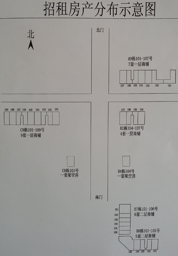 八、竞租开标时间:2016年7月26日上午8:30时始开标,标的为B7号6间、B8号5间、B4和C8号各1间,共13个。2016年7月28日上午8:30时始开标,标的为A9号7间、B2号4间和C9号9间,共20个。