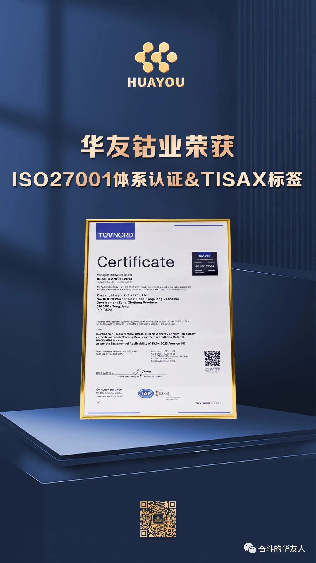 TISAX, launched by the German Association of the Automotive Industry, is one of the highest standards in the field of information security. It is built to evaluate and certify information security management systems in the automotive supply chain, to safeguard high safety standards in the automotive industry, protect sensitive information, and prevent data breaches. Currently, TISAX certification is highly regarded among automotive OEMs globally. For suppliers, this assessment and certification means a pass of all participating parties, including automotive OEMs. The TISAX label granted means that Huayou's information security system has been widely recognized by the industry and is a pass to enter the international new energy vehicle supply chain.