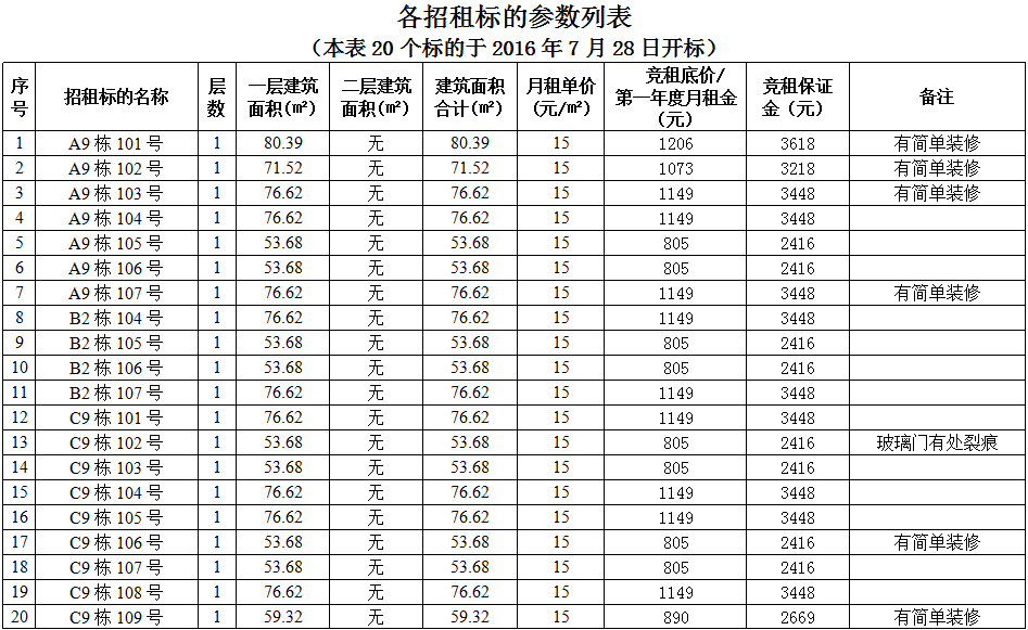 八、竞租开标时间:2016年7月26日上午8:30时始开标,标的为B7号6间、B8号5间、B4和C8号各1间,共13个。2016年7月28日上午8:30时始开标,标的为A9号7间、B2号4间和C9号9间,共20个。