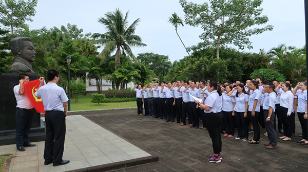 告别临高角,党员干部驱车来到了位于海口琼山区云龙镇的冯白驹故居,从平坦的大道进入村庄,在盘根错节浓荫如盖的老榕树旁,便是冯白驹将军的故居。走近故居,映入眼帘的是一座竖立在庭院正中的冯白驹半身铜像,冯白驹刚毅的面容令人肃然起敬。金年会登录手机党员干部面对党旗和冯白驹将军的铜像重温入党誓词,右手拳头紧握,声音铿锵有力,不忘初心,牢记使命。在誓词中,党员的责任感、使命感、紧迫感油然而生。